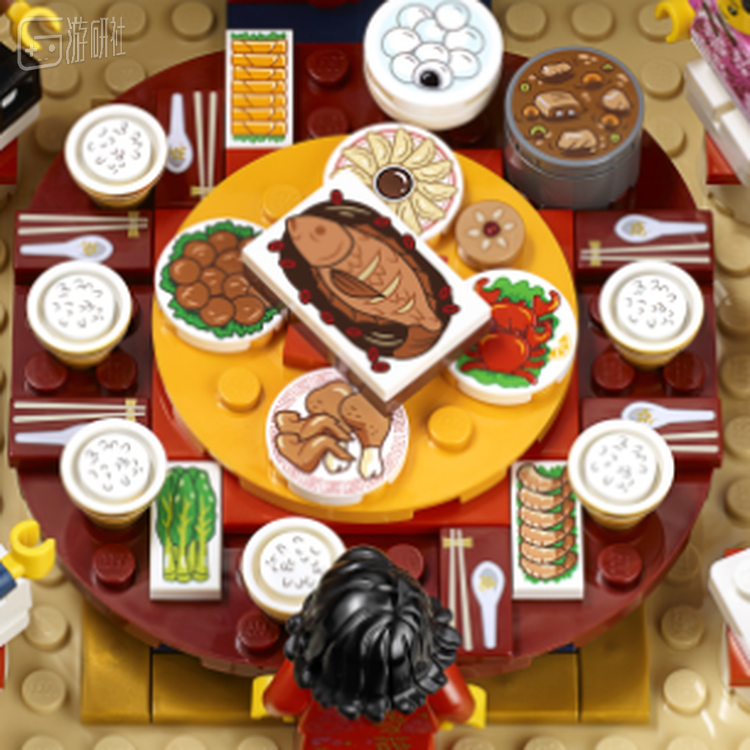 乐高®【年夜饭】展现了中国家庭欢聚一堂,其乐融融庆祝农历新年的场景。传统中式厅堂里,门口的红灯笼和窗框上的对联烘托着新春氛围,乐高®小人仔换上了中式的红色新衣围坐一起,可转动的餐桌上摆满了饺子、鱼、春卷等年夜饭的传统菜肴,准备开饭啦……从房间角落的冬日梅花,到孩子手上的红包,每一个我们熟识的过年场景都用乐高积木拼搭出来了,惟妙惟肖,充满乐趣。