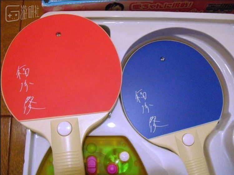 一看这游戏机的包装,还以为是红双喜的球拍呢。里面也确实有两块标准乒乓球拍大小的输入设备,球拍上头还印有福原爱的签名。