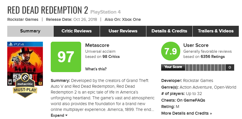 尽管游戏评分并不能完全决定它的实际价值,但这仍旧可以说代表了大多数人的共识。相对于其他游戏评分媒体的一家之言,Metacritic(以下简称MC)的评分由于集合了各家媒体和玩家的整体评价,能相对更真实的反应一个游戏的口碑。