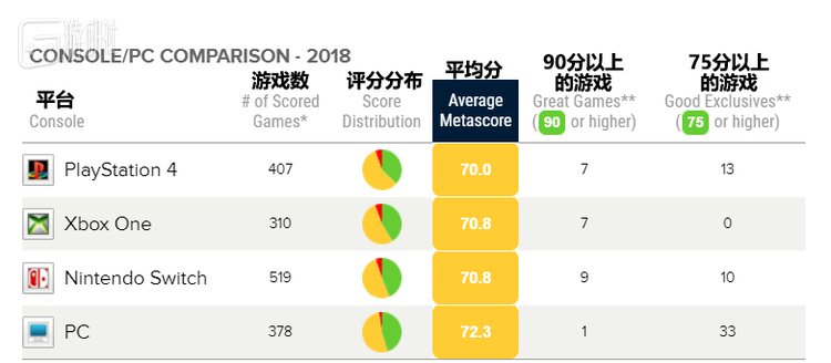 确实,去年NS上发售了大量的移植或者复刻游戏,但从整体质量上来讲,这些游戏的素质都比较不错,这一方面归功于开发者对于游戏的二次筛选,另一方面在移植的过程中,他们也可以对自己的作品做出一定程度的修补。所以,无论是从整体游戏数量,还是整体评分来看,NS在2018年的表现都是四个平台里最好的。