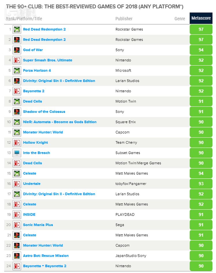 2018年,MC评分达到90分以上的24款游戏(包含多平台)