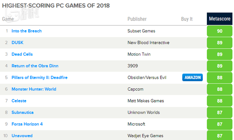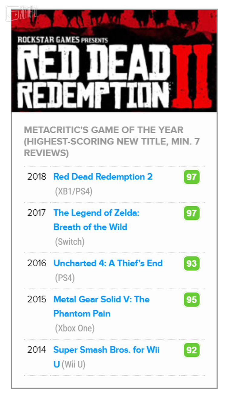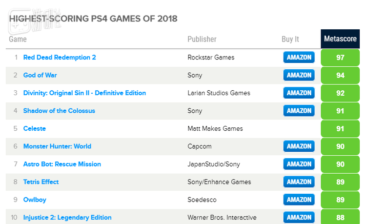 针对去年发售的游戏,MC根据其评分将它们汇总起来,制作了一份年度游戏评分的榜单。其中,《荒野大镖客2》平均分97分年度最佳,新《战神》均分94排名第2。