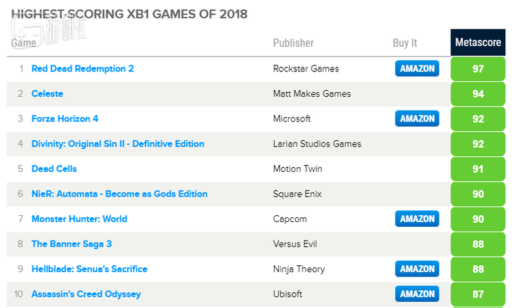 2018年,MC评分最高的10款Xbox One游戏。对比前面的PS4榜,其中大部分游戏都是相同的。