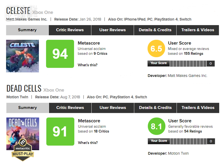 另外,虽然相当数量的高分游戏都是以往成功游戏的续作,但其中仍旧有不少新的名字出现,《死亡细胞》(X1版:91分)和《蔚蓝》(X1版:94分)就是其中非常典型的例子。