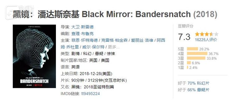 先前一直有“自从Netflix接手了《黑镜》系列后,它就跌下了神坛”的评价,Netflix这次把尝试交互式电影的机会给《黑镜:潘达斯奈基》,很可能也是想让它借此打个翻身仗。