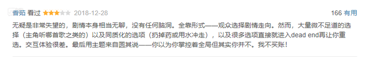 在众多诟病中,最多的批评就是“形式大于内容”,对于诸多无意义选项,以及总是重复循环送到眼前的坏结局,一些观众并不买账。