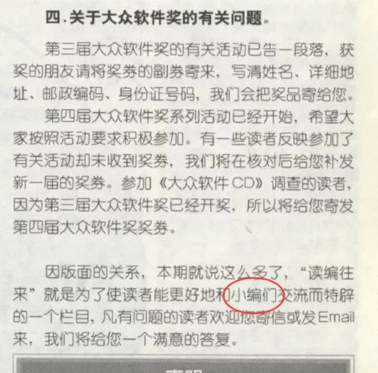大软的读编往来栏目,是“为了使读者能更好地和小编们交流而特辟地一个栏目”,小编一词的诞生也是同样道理,是为了与读者拉近距离而做出的主动改变。