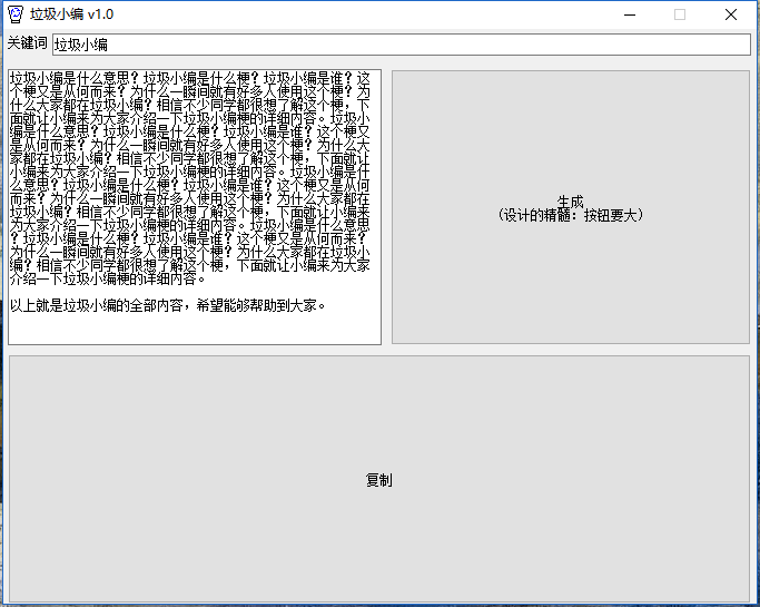 后来有好事者直接编程做出了“垃圾小编生成器”,只要输入关键字,就能生成一大段专属的小编话术: