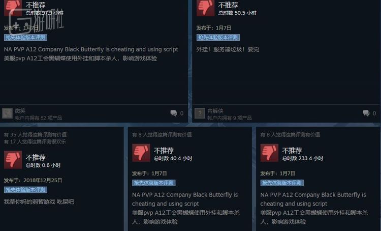 不过这些玩家也并非只把打外国人作为最高判断准则。和单身狗一样在贴吧被频繁提起的另一个名字叫“黑蝴蝶”,由于这个工会在游戏里打出了一系列超出常规的操作,在国外论坛上被公认是“作弊工会”,Steam的评论区也能看到大量国人用双语投诉黑蝴蝶开挂。