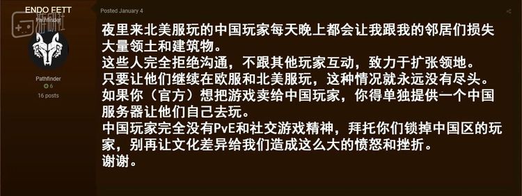 那些喊着自己在游戏里遭受了非人虐待的老外也不是没有投诉,论坛上除了封禁中国玩家的愤怒请愿,也不乏“申请官方专门开一个中国服务器”的认真提议。