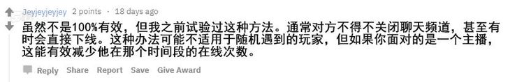 一个自称曾经试验过这种操作的用户告诉其他人,他之前遇到主播时不断刷这些内容,对方不得不关闭了聊天频道,甚至退出游戏。“这种办法可能不适用于随机遇到的玩家,但如果你面对的是一个主播,这能有效减少他在那个时间段的在线次数。”他说。
