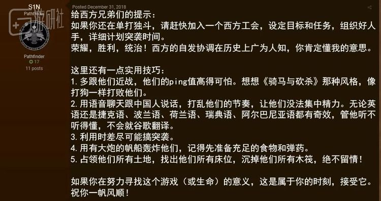 不过单打独斗的小分队终究难成大气候,在论坛上就有人整理了5条“干货教程”,提醒玩家不要试图自己去和中国人对抗,最好找一个欧美工会加入,在攻击前精心策划战术,人多力量大。