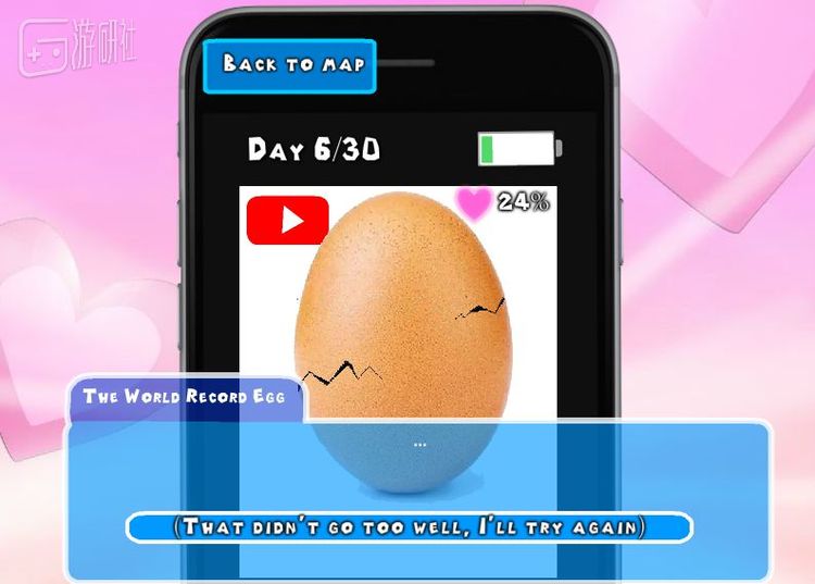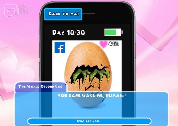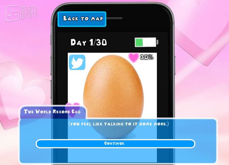 1台手机,包括Instagram、Twitter、Facebook、YouTube在内的4个App就是你玩游戏的场景。你一共有30天,在这段时间里你需要点进每个App寻找这颗世界名蛋,跟它互动刷好感,最后攻略它。手机右上角有电量槽,电量相当于体力,在手机上每操作一次就会消耗一定的数值,当电量不足以支撑继续操作,就需要跳到下一天充满电。
