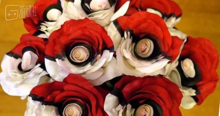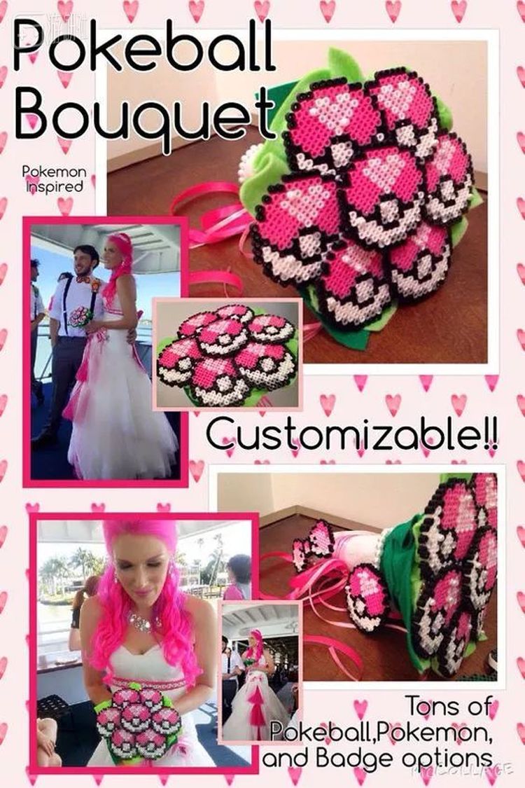 新娘手里的捧花也有满满的宝可梦元素。有的玫瑰花被涂成了精灵球的颜色,而有的捧花根本就是用拼豆豆做成的像素花。
