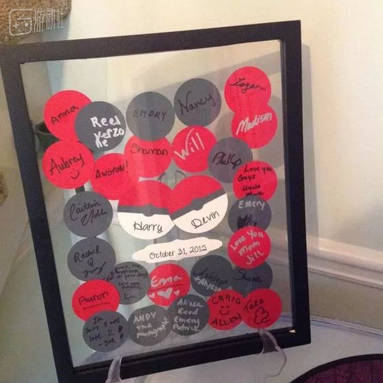 有人把新人的名字写在精灵球纸片上,再用亲友签名的祝福贴纸环绕在精灵球周围,获得众星拱月般的祝福。
