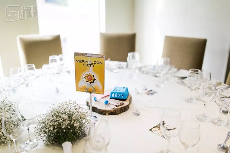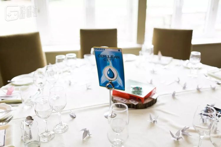 精心布置的会场里,小到桌子的编号也可以体现出宝可梦特色。在下面这场宝可梦婚礼中,宾客就坐的每一张桌子都用不同的《精灵宝可梦》城市名字来标记区分,枯叶市、华蓝市……挨桌吃过去可能也算集齐道馆徽章了。
