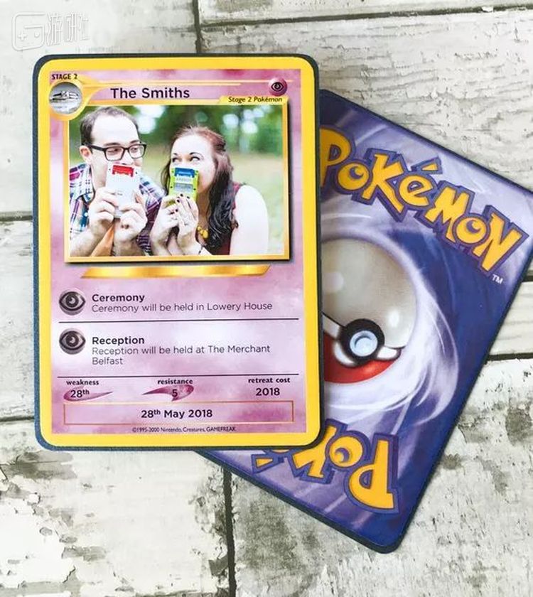 下面这张请柬是一对外国夫妻根据宝可梦卡牌来设计的。他们修改了宝可梦卡牌的各个模块,把宝可梦图片换成夫妻二人的合影,在技能栏里设置了“Ceremony(典礼)”和“Reception(招待会)”两个技能,效果描述分别是婚礼举行场地以及仪式结束后宴请宾客的场地。卡牌底部的弱点、抗性和撤退费用三项分别用于标出婚礼举行的月/日/年。