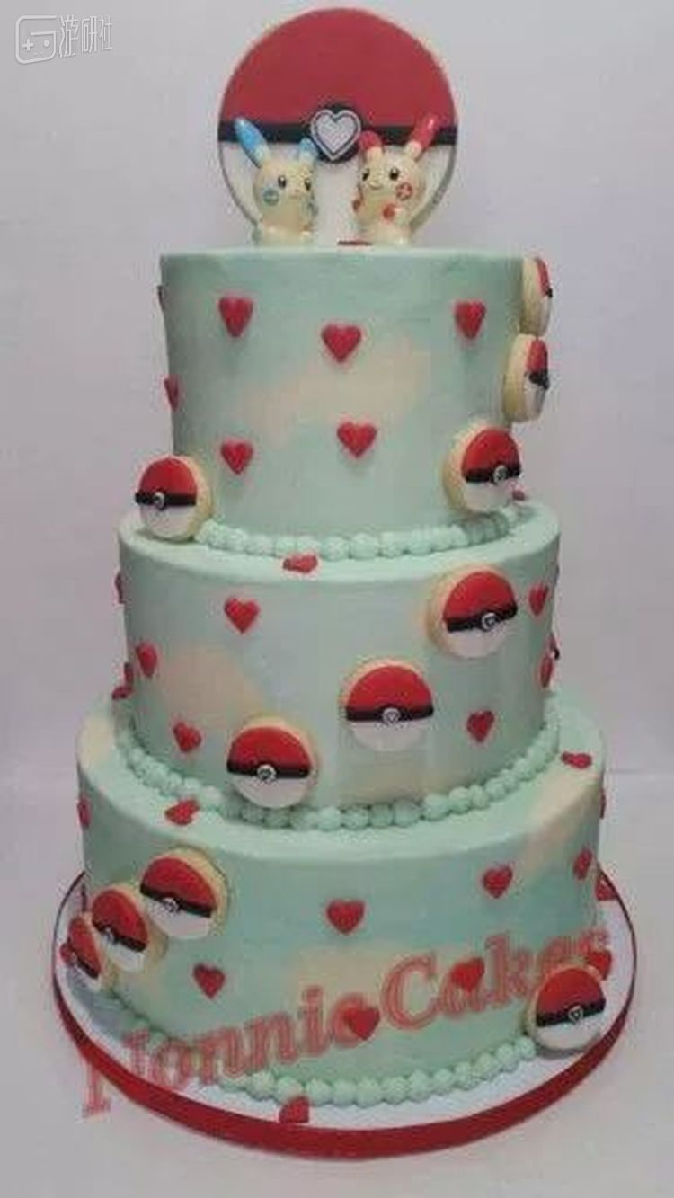 下面这个走小清新路线的蛋糕倒是没有太多宝可梦成分,只有皮卡丘和卡比兽孤零零坐在最上层,看这反差感十足的组合……莫非是在暗示夫妻俩的体型差?