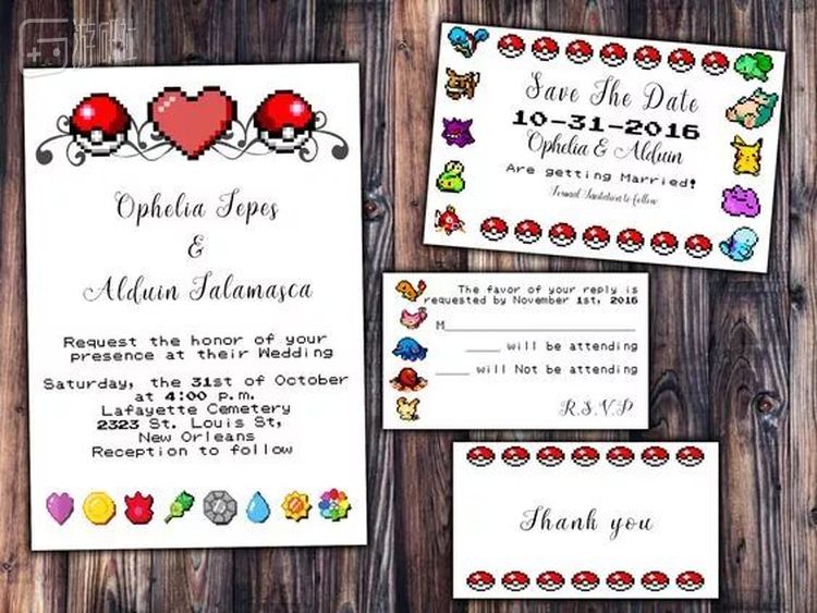 有时小小的一张宝可梦卡牌不够承载所有信息和创意,也可以出设计规格更大、数量更多的请柬。下面这套请柬就一共设计了4张卡片,分别是婚讯通知卡、邀请函、出席确认卡和致谢卡片,每一张都用像素画风的宝可梦、精灵球以及道馆徽章环绕点缀。