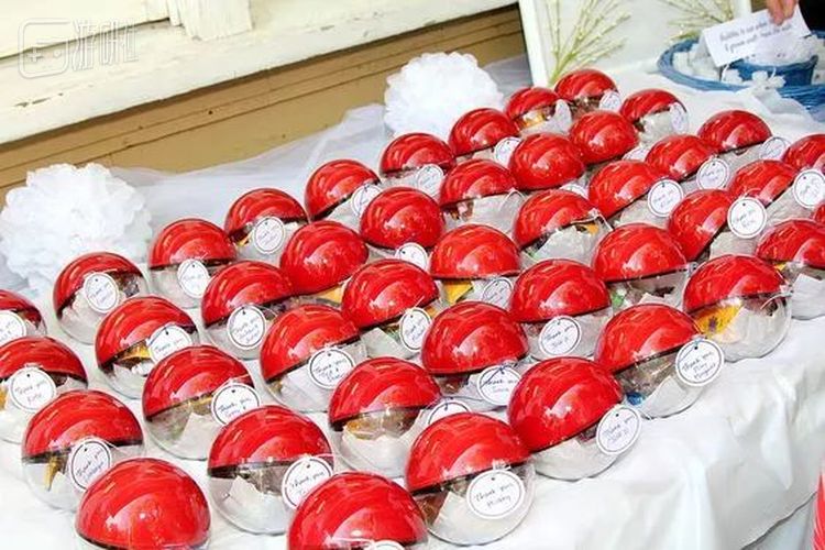 也有人直接用精灵球来盛放伴手礼,与原版精灵球不同的是,下面的伴手礼精灵球外壳是半透明的。