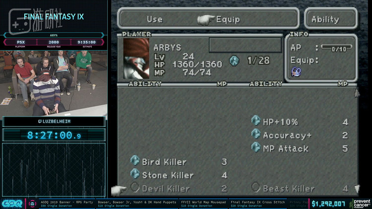 这位戴着眼罩的玩家名叫Luzbel,这个时候他正在进行PS版《最终幻想9》的RTA挑战。RPG游戏的RTA直播是漫长且有些枯燥的,也许是为了调剂下观众的情绪,他开始秀了一项技能:在蒙眼状态下快速进行装备品以及角色技能的整理。