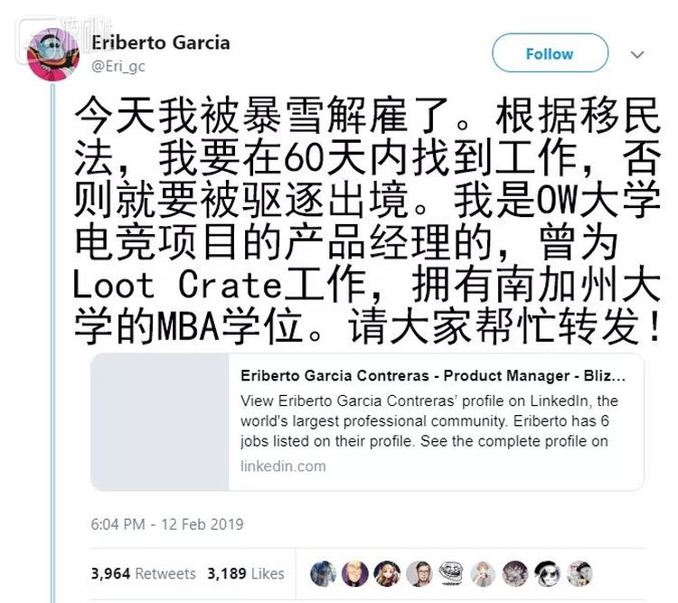 这次裁员来得太突然,大部分人还没做好准备就在一脸懵逼中被开了。前天下午前《守望先锋》大学电竞项目的产品经理加西亚火速把自己的简历发到了推特上,根据移民法,如果他在60天内没有找到其他工作,就要面临被驱逐出境的后果。