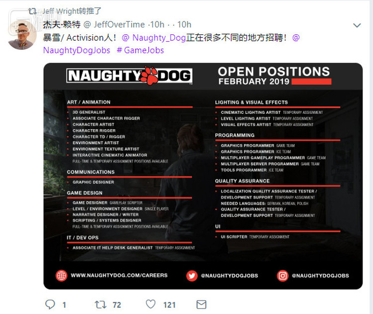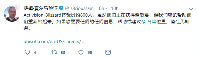 育碧的高级制作人夏尔马、顽皮狗的游戏设计师杰夫等也都贴出了自家招聘链接,希望能帮被裁掉的同行们一把: