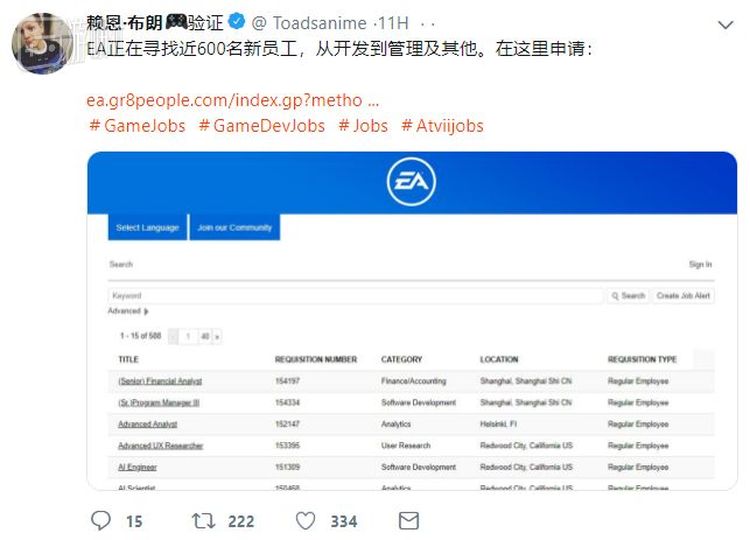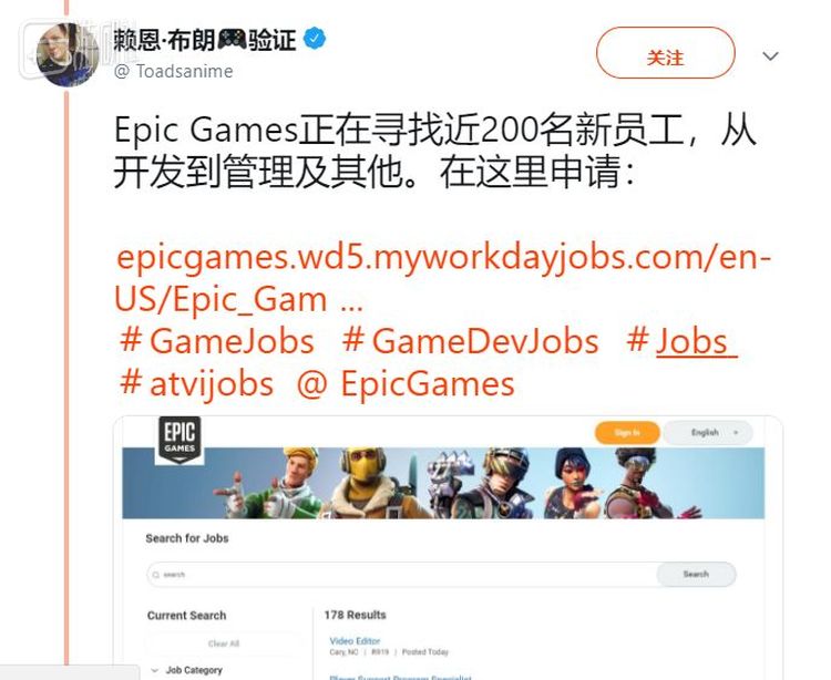 EA、Epic这两家似乎更缺人手,从游戏新闻从业者莱恩·布朗分享出的招聘信息来看,它们分别有着600人和200人的职位空缺: