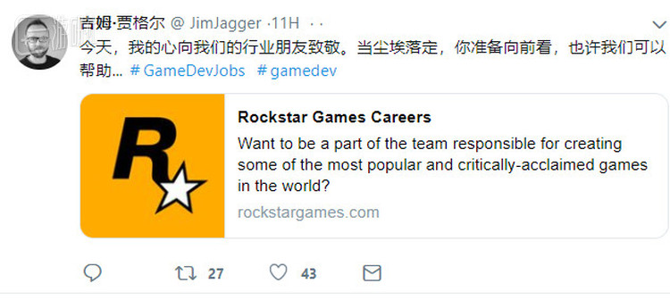 R星的动画总监吉姆在推特上致敬了这些同行,然后话锋一转:其实我们这里也在招人……