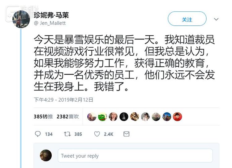 同样难过的还有前《魔兽世界》副品牌经理珍妮弗,她以前一直认为即使裁员在游戏行业很常见,但只要自己努力当个优秀员工就不会被裁,但现在她发现自己错了。