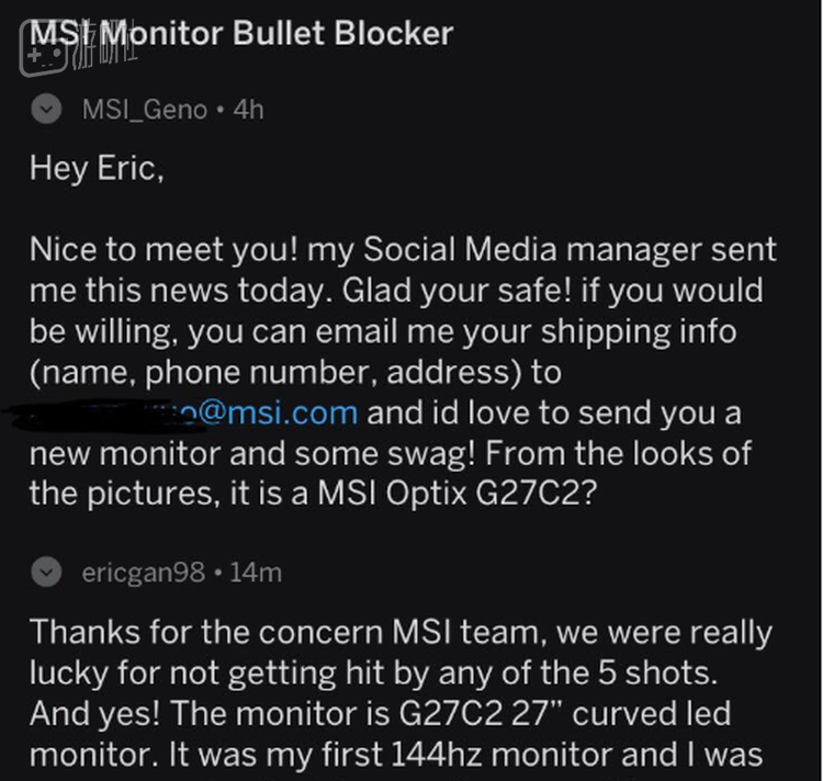 在推特上发布了这段神奇的经历以后,微星官推第一时间慰问了Eric并表示会送一台全新的显示器给他。