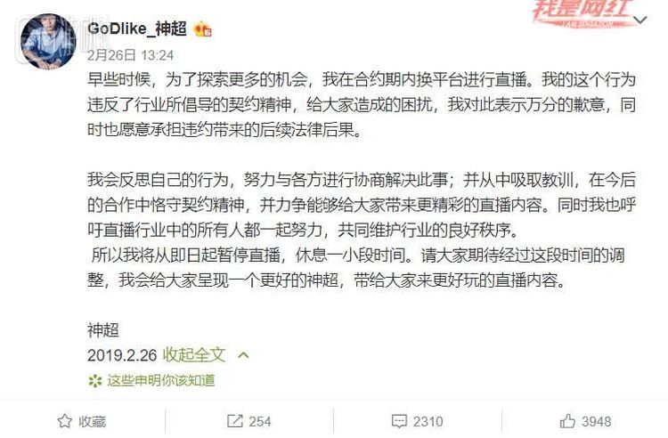 公告发布不久之后,此前因从斗鱼跳槽至虎牙的神超、久哥哥先后发表道歉声明,称将从即日起暂停直播。