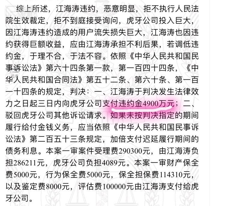 嗨氏从虎牙跳槽斗鱼被判的违约金金额达4900万元