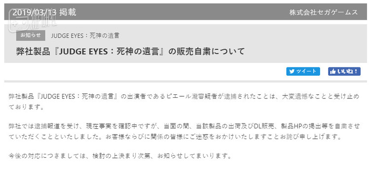 就在这件事被曝光之后,《审判之眼》的发行商世嘉也立刻在官网上做出回应,宣布将对《审判之眼:死神的遗言》的贩售进行自肃,暂时停止贩售以及相关宣传。