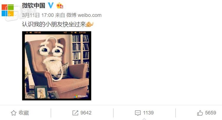 3月11日,微软中国发布了一条有关曲别针助手的微博,图片中的白胡子白眉毛曲别针老头儿,戴着老花镜坐在沙发上呼喊着:“认识我的小朋友快坐过来。”