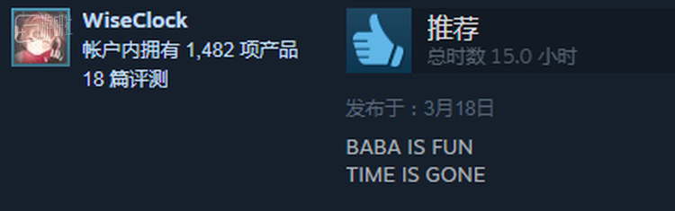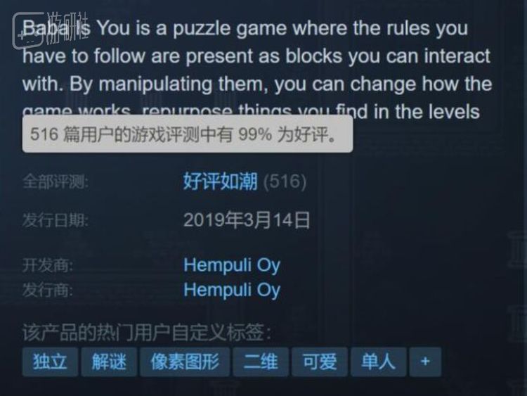 随着口碑的发酵,越来越多的玩家开始关注《Baba Is You》。就在这篇文章即将发表的前夕,突然发现之前“没有中文”的差评消失了。这或许是对游戏质量的另一种肯定吧。