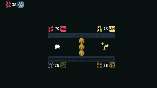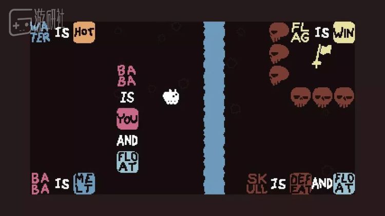 游戏的关卡里,除了玩家角色、墙壁、石头、旗帜等我们熟悉的经典游戏元素外,还有不少可以推动的“词语”箱子。 比如每一关都有分别写着“BABA”、“IS”、“YOU”的箱子。它们并排组成了“Baba is you”(爸爸是你)这句话。