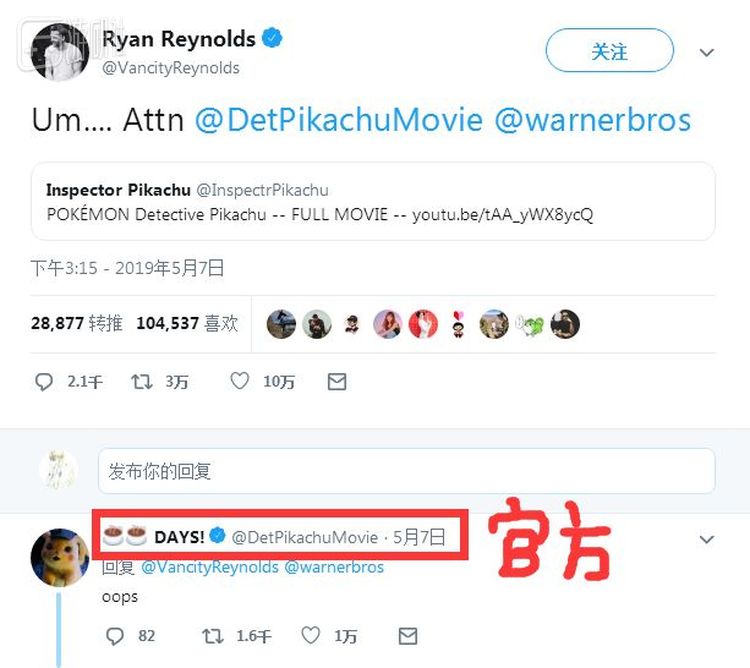 电影中皮卡丘的配音演员瑞安·雷诺兹也发现了这个“完整版”电影,还把这个视频PO了出来,假惺惺的艾特了官方说:“请注意”。