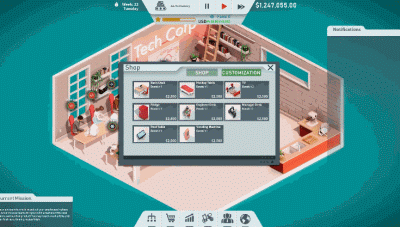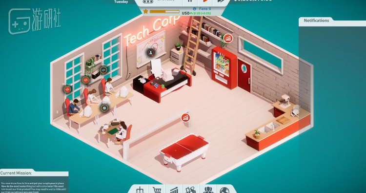 简单说来,《Tech Corp.》有两大块儿内容,一部分是像《主题医院》或者开罗游戏一样,你需要自己装修办公室,添置办公设备,雇佣不同属性和特长的员工,以保证你日常的经营。