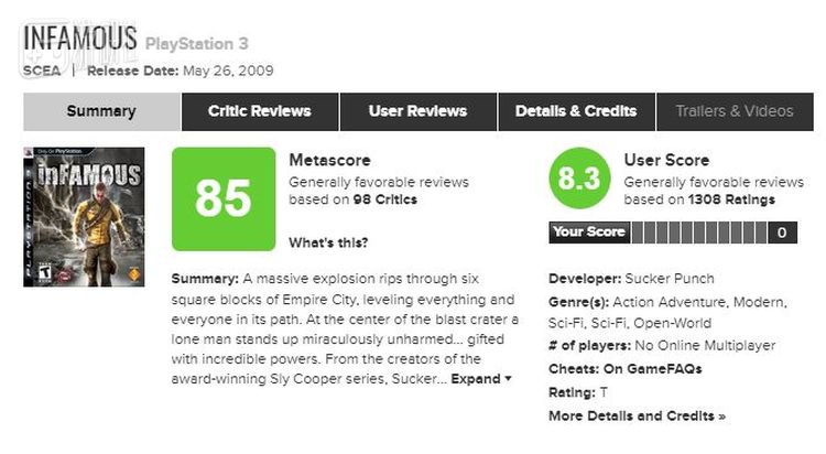 在Metacritic上,初代《恶名昭彰》媒体评分保持在85分,玩家评分也有8.3分。游戏中的许多元素,包括超能力,动作系统,游戏的光影特效和任务结构等都受到了不少好评,作为一款全新IP的作品来说,这样的成绩已经足够出色,并且让制作组Sucker Punch有理由继续挖掘这个系列的价值。