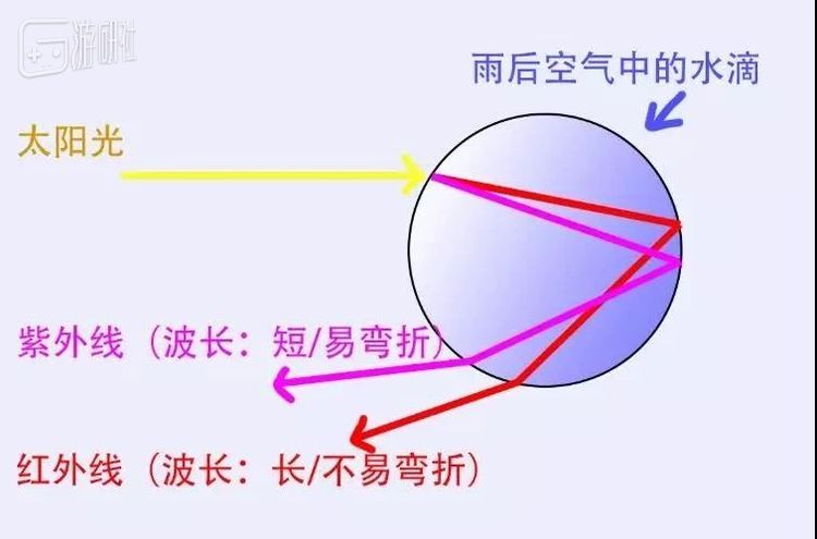 也就是说我们完全可以把水滴看作是一个形态复杂的三菱镜,这样一来形成彩虹的几个要素就会变得非常明晰: