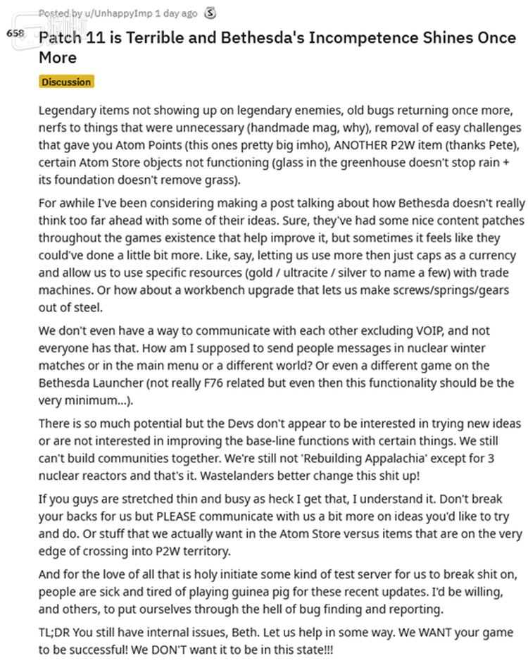 尽管《辐射76》的老玩家们一贯脾气都不错,但这次他们也觉得忍不了了。很多玩家在官方论坛和Reddit上留言,建议B社为《辐射76》增加一个测试服务器,以免每次更新之后出现的新Bug对玩家的游戏体验造成打击。