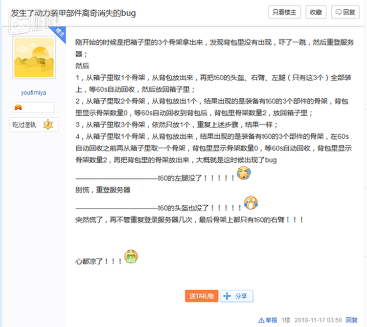 这其实不是《辐射76》第一次出现类似的Bug。早在2018年11月,就有玩家反应,在游戏更新后自己的动力装甲部件离奇失踪。只不过,在经过多次游戏更新后,这个Bug居然又被加回到游戏里了,这实在是令人感到匪夷所思。