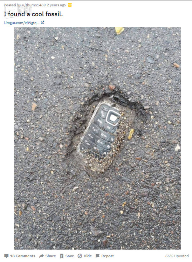 这个帖子下面,人们最多只是怀疑了图片真正的来源出处,没有人去质疑这个躺在沥青“地质结构”中的手机的“化石”属性,毕竟这种出场方式,与千万年前历史的三叶虫化石的沧桑程度相比不落下风。