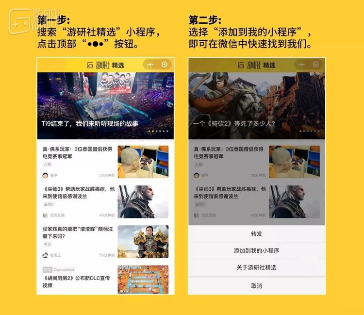 如果你错过了夜里12点的推送,或者想时刻看看游研社更新了哪些新东西,你就可以随时随地打开小程序刷一刷。你可以参考下方图片,把它添加到“我的小程序”里。
