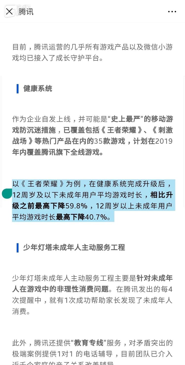 而下面这个,是腾讯公众号今年3月的文章节选,说健康系统上线后,12岁以下未成年用户游戏时长最高减少59.8%,12岁以上最高减少40%。