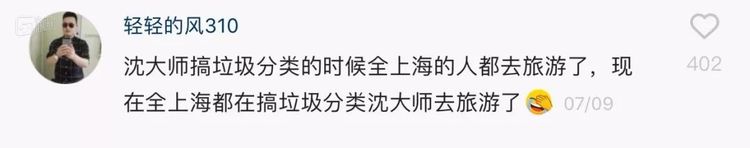 而就在沈巍脱离垃圾堆,开始到处参观的这个夏天,上海市一场轰轰烈烈的垃圾分类也开始了。在沈巍发布的一条短视频下,网友的一句话被顶上了热评:“沈大师搞垃圾分类的时候全上海的人都去旅游了,现在全上海都在搞垃圾分类,沈大师去旅游了。”