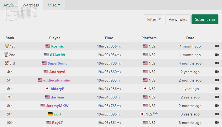 两个月前,一名叫Kosmic的美国玩家打破了初代《超级马里奥兄弟》的“Warpless”速通记录,首次将该类速通成绩突破到低于19分钟,达到18分59秒86。
