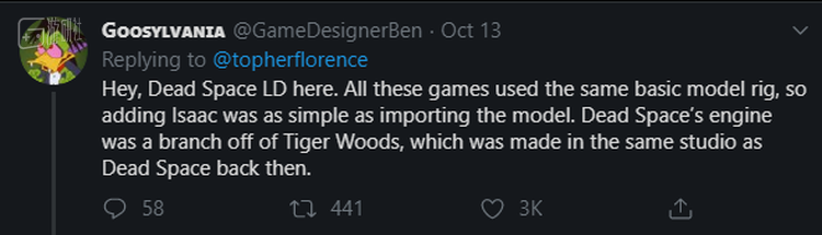《死亡空间》的引擎压根就是从《泰格伍兹大师赛》的引擎魔改来的。这两个游戏里角色的动画骨骼都一模一样,只要把艾萨克的美术素材导入《泰格伍兹大师赛》,这位朋友就能自动学会像大师一样打高尔夫球。