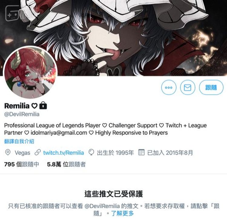 Remilia的推特账户现在已经被锁定,在那里只能看到她的背景图:《东方Project》里的蕾米莉亚,这是也她ID的来源。